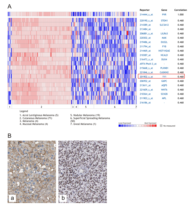 Figure 4: Correlation of YY1 with NECL-5 in melanoma. Heat map of genes positively correlated with NECL-5 (r = 0.5) by Pearson correlation analysis in the Xu melanoma dataset (A). Immunohistochemistry evaluation of NECL-5 and YY1 in a representative case of melanoma respectively in Panel (a) and (b) (B).