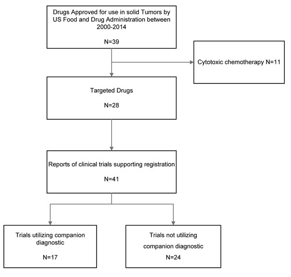 All targeted, anticancer agents approved by the US Food and Drug administration (FDA) between January 2000 and April 2014 for treatment of advanced or metastatic solid malignancies in adults were identified through the FDA website [20]. We excluded agents used in supportive cancer care, such as antiemetic drugs or bisphosphonates. We also excluded studies of cytotoxic chemotherapy, systemic radiation therapy, endocrine therapy and cancer vaccines. Drug labels of included agents were consulted for all referenced RCTs. We reviewed each article and identified those that used a companion diagnostic to select patients. We also reviewed the FDA website to evaluate those companion diagnostic tests approved for the specific indication.