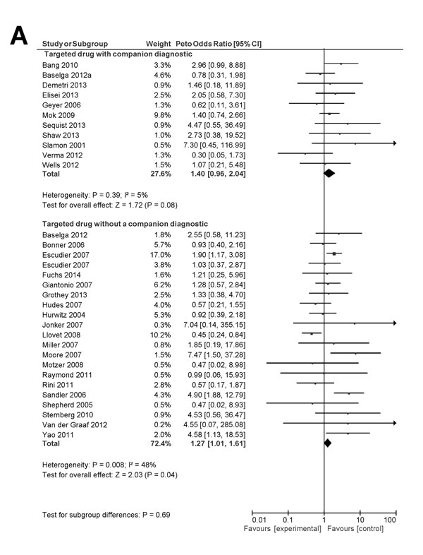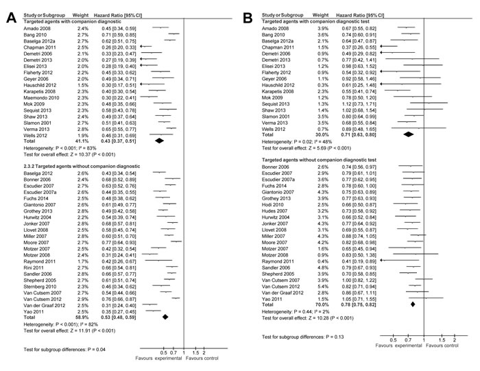 Data on OS and PFS were available from 39 and 41 studies respectively. Compared to agents used in control groups, targeted drugs used in experimental arms of included trials showed improved PFS and OS. The magnitude of improvement in OS between targeted drugs in experimental groups and agents used in control groups was similar for targeted drugs with companion diagnostics and those without companion diagnostic tests (HR 0.71, 95% CI 0.63-0.80 vs. HR 0.78, 95% CI 0.75-0.82, p for difference = 0.13, Figure 2B). When studies for conditions with ubiquitous molecular alterations or mutations [7-10] were excluded, there remained no difference between studies with companion diagnostics and those without (HR 0.70, 95% CI 0.61-0.80 vs. HR 0.78, 95% CI 0.75-0.82, p for difference = 0.11).