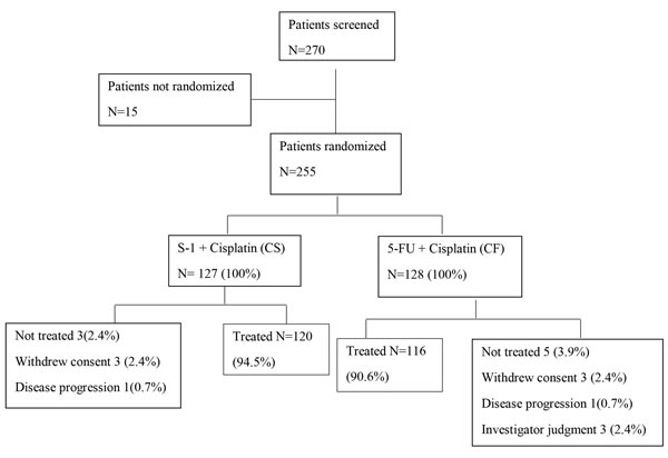 Patients who satisfied all eligibility criteria were randomly assigned in a 1:1 ratio to receive S1 (Shenzhen Wanle Pharmaceutical Co., Ltd. China) plus cisplatin (CS group) or fluorouracil plus cisplatin (CF group). As a pilot study, there is no need for sample size calculation. We planned to enroll 270 patients.