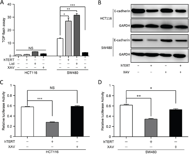 Since previous studies showed that hTERT promotes EMT by activating the Wnt signaling in gastric cancer cells [8, 17], we examined Wnt activity in SW480 and HCT116 cells; however, we found that Wnt activity was significantly lower in HCT116 cells than in SW480 cells (Figure 2A). Further studies showed that hTERT could promote Wnt activity in SW480 cells, but not in HCT116 cells (Figure 2A). We also treated SW480 and HCT116 cells with a Wnt signaling activator (LiCl) and inhibitor (XAV), and found the expected responses in SW480 cells but not in HCT116 cells (Figure 2A). We next detected E-cadherin expression, which was significantly down-regulated both in SW480 and HCT116 cells by hTERT overexpression, and Wnt signal inhibition could restore E-cadherin expression in SW480 cells even when hTERT was overexpressed (Figure 2B and Supplementary Figure S2A). In contrast, Wnt inhibition could not restore E-cadherin expression in HCT116 cells (Figure 2B and Supplementary Figure S2B).
