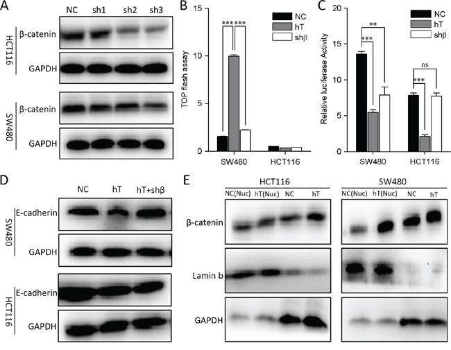 Figure 3: Interfere with β-catenin in HCT116 and SW480 cells. A. β-catenin knocks down in HCT116 and SW480 cells. B. HCT116 and SW480 cells were co-transfected with 100 nM hTERT plasmid and a TOP-FLASH reporter (0.1 ng/well in each 96-well plate), and 100 nM β-catenin interfere plasmid were added TOP-FLASH reporter activation was tested 48 h later. A scrambled construct was used as a negative control (NC). *P < 0.05 compared to control. C. The relative luciferase activity of the E-cadherin promoter in HCT116 and SW480 cells. D. Western blot of E-cadherin in HCT116 and SW480 cells(Lane1, No treatment; Lane2, hTERT overexpression; Lane3, hTERT overexpression plus β-catenin inhibition). E. Western blot to detect the β-catenin expression in nucleu and the total protein of HCT116 and SW480 cells.