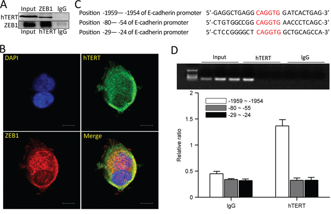 Figure 4: hTERT and ZEB1 form a complex and bind the E-cadherin promoter. A. HCT116 cells were collected andlysates were subjected to IP using anti-hTERT, anti-ZEB1and rabbit IgG antibodies. Co-precipitating proteins were detected by western blot. B. Immunofluorescence staining for hTERT (green) and ZEB1 (red) in HCT116 cells. A representative mergedimage is shown (yellow denotes colocalization). C. Three binding sites for the E-cadherin promoter were designed. D. PCR quantification of immunoprecipitated E-cadherin promoterin ChIP assays from HCT116 cells with Abs against hTERT and the respective control IgG. Amplified E-cadherin promoter regions contained ZEB1 binding sites at −1959 and −1954. Values represent relative binding to input.