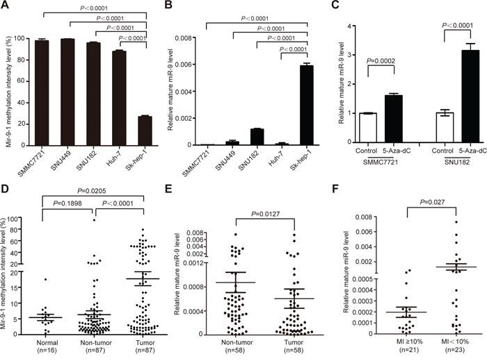 Figure 1: Methylation contributed to miR-9 aberrant down-regulation in HCC. A. The methylation intensity (MI) of mir-9-1 in SMMC7721, SNU449, SNU182, Huh-7 and Sk-hep-1. B. The relative expression level of miR-9 in 5 HCC cell lines (mean ± SEM; N = 3). C. The relative miR-9 level in SMMC7721 and SNU182 before and after demethylation treatment using 5-aza-2′-deoxycytidine (mean ± SEM; N = 3). D. The methylation intensity (MI) of mir-9-1 in 87 pairs of HCC tumor tissues and adjacent non-tumor tissues and 16 healthy live tissues. Data were presented as mean ± SEM. E. The relative expression level of miR-9 in 58 pairs of HCC tumor tissues and adjacent non-tumor tissues. Data were presented as mean ± SEM. F. The expression level of miR-9 in methylated group (MI ≥ 10%) and unmethylated group (MI < 10%). Data were presented as mean ± SEM. Significant differences were determined using Student t tests.
