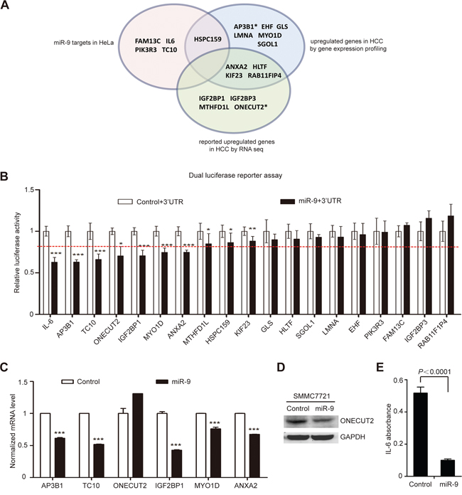 Figure 3: Comprehensive screening for miR-9 downstream target in HCC. A. Systematic identification of miR-9 targets based on multiple selection strategies. The pink area indicates miR-9 target genes confirmed in HeLa cells; the blue area indicates upregulated genes in 6 pairs of primary HCC tissues by gene expression profiling; the green area indicates previously reported upregulated genes in HCC by RNA sequencing. *represents the previously reported target genes of miR-9. B. The results of luciferase activity detection. ‘miR-9+3′UTR’ and ‘control+3′UTR’ means SMMC7721 cells co-transfected with pGL3-Luc-3′-UTR-WT and U6-mir-9-1 or U6-control vector (see Materials and Methods section for details). The data represents the mean ± SEM of 3 independent experiments done in 9 repeats. The red dotted line indicates the 20% suppression rate. C. Real-time RT-PCR results of validating the relative mRNA level change of potential miR-9 target genes in SMMC7721 (mean ± SEM; N = 3). D. Western blot results of detecting ONECUT2 protein levels before and after miR-9 expression in SMMC7721. GAPDH was used as a loading control. E. ELISA results of measuring the concentration of IL-6 in the SMMC7721 cell supernatant before and after ectopic expression of miR-9 (mean ± SEM; N = 3). P values < 0.05 (*), < 0.01 (**) or < 0.001 (***).