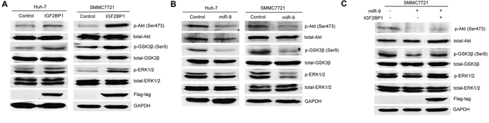 Figure 5: The suppressive function of miR-9 for ERK and AKT pathways by targeting IGF2BP1 in HCC. A. Western blot result of indicated protein level before and after IGF2BP1 expression in Huh-7 and SMMC7721. GAPDH was used as a loading control. B. Western blot result of indicated protein level before and after miR-9 expression in Huh-7 and SMMC7721. C. Western blot result of indicated protein level in SMMC7721 cells transfected with vector control, miR-9 only, or the combination of miR-9 and IGF2BP1.
