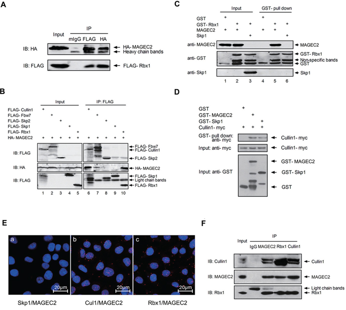 Figure 1: MAGE-C2 binds with Rbx1 and Cullin1. A. MAGE-C2 binds with Rbx1. Lysates from HEK293T cells co-transfected with HA-MAGE-C2 and FLAG-Rbx1 were immunoprecipitaed with anti-FLAG, anti-HA antibodies or control mouse IgG followed by immunoblotting with indicated antibodies. B. MAGE-C2 binds with Cullin1 and Fbw7. HEK293T cells were transfected as indicated at the top, immunoprecipitated with anti-FLAG antibody, and bound proteins were detected by immunoblotting with anti-FLAG or anti-HA antibodies. C. MAGE-C2 binds Rbx1 directly. GST pull-down experiment was performed with GST-fused Rbx1 or GST (a negative control) and purified MAGE-C2 or Skp1 (as a negative control). Proteins were detected with Western blotting. D. MAGE-C2 binds Cullin1 directly. GST pull-down experiment was performed with the in vitro translated Cullin1 and GST-MAGE-C2, GST-Skp1 (a positive control) or GST. Proteins were detected with Western blotting. E. Associations of MAGE-C2 with Cullin 1 and Rbx1 were visualized in A375 cells with an in situ proximity ligation assay. The interaction was visualized as red fluorescent spots. The cells were counterstained with Hoechst (blue) to visualize the nuclei. F. Endogenous MAGE-C2, Rbx1 and Cullin1 bind with each other. Immunoblot analysis of SK-mel-37 cell lysates and the immunoprecipitates with indicated antibodies. Rabbit IgG was used as a negative control for the immunoprecipitation.