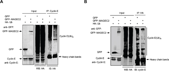 The in vivo ubiquitylation assay has been described previously [32]. Briefly, GFP or GFP-MAGE-C2 and HA-Ub were co-expressed in HEK293T cells. At 36 hours post-transfection, cells were treated with MG132 (20 μM) for 8 hours and then cell extracts were subjected to immunoprecipitation with anti-cyclin E or anti-HA antibodies, and copurified proteins were immunoblotted with appropriate antibodies.