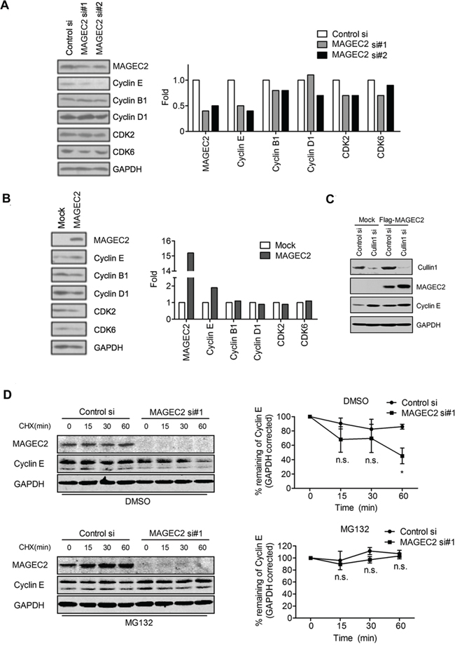 Figure 4: MAGE-C2 regulates cyclin E stability in cells. A. MAGE-C2 knockdown decreases cyclin E protein levels. MAGE-C2 siRNA or control siRNA was transfected into A375 cells. Lysates were prepared 48 h after transfection and immunoblotted with anti-MAGE-C2 antibody. Cyclin E, cyclin B1, cyclin D1, CDK2, CDK6 and GAPDH protein levels were analyzed by immunoblotting with indicated antibodies. Expression levels of GAPDH are indicated as an internal control. The quantitative data is shown in right graphs. B. Overexpression of MAGE-C2 increases cyclin E protein levels. HEK293T cells were transfected with MAGE-C2-expressing or control (mock) vectors and lysates were prepared 48 h after transfection. MAGE-C2, cyclin E, cyclin B1, cyclin D1, CDK2, CDK6 and GAPDH protein levels were analyzed by immunoblotting with indicated antibodies. C. Cullin1 is required for MAGE-C2 induced enhancement of cyclin E. FLAG-MAGE-C2 and Cullin1 siRNA were cotransfected into HEK293T cells, and cells were harvested at 48 h after transfection. Immunoblotting were performed with indicated antibodies. D. Downregulation of MAGE-C2 decreased cyclin E protein half-life. MAGE-C2 siRNA or control siRNA was transfected into A375 cells. Twenty-four hours after transfection, cells were treated with vehicle (DMSO) or MG132 (20 μM) for 8 h before addition of CHX (50 μg/ml). Cells were harvested for Western blotting at the indicated time. The results were plotted after quantitation (right).