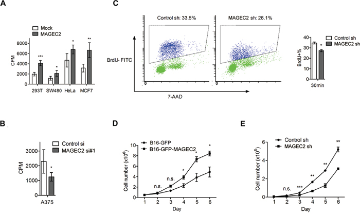 Figure 6: MAGE-C2 promotes cell proliferation. A. Overexpression of MAGE-C2 increased DNA synthesis. HEK293T, SW480, HeLa and MCF7 cells were transfected with MAGE-C2-expressing or control (mock) vectors. Seventy-two hours later, 3H-thymidine incorporation was measured as described under Materials and Methods. The mean and standard deviation of triplicate measurements are shown. B. Knockdown of MAGE-C2 suppressed DNA synthesis in A375 cells, as determined by 3H-thymidine incorporation assay. C. MAGE-C2 stable knockdown suppressed DNA synthesis in A375 cells, as determined by BrdU incorporation assay. D. Stable overexpression of MAGE-C2 significantly promoted B16 cell growth in the course of 6 days. The cell growth was monitored by counting cells at indicated times. E. Stable knockdown of MAGE-C2 inhibited A375 cell growth, as determined by counting cell numbers. The mean and standard deviation of triplicate measurements are shown.