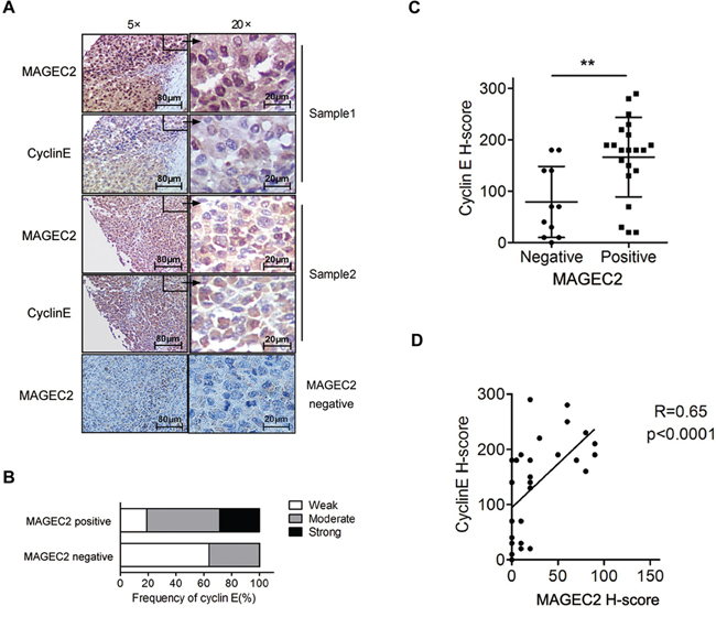 Figure 7: Expression levels of cyclin E correlate with MAGE-C2 expression in malignant melanoma tissues. A. Examples of IHC for the MAGE-C2 or cyclin E in melanoma samples. B. and C. Distribution of cyclin E expression levels in the MAGE-C2-positive and MAGE-C2-negative tissues. D. Pearson correlation analysis of the expression levels of cyclin E and MAGE-C2.