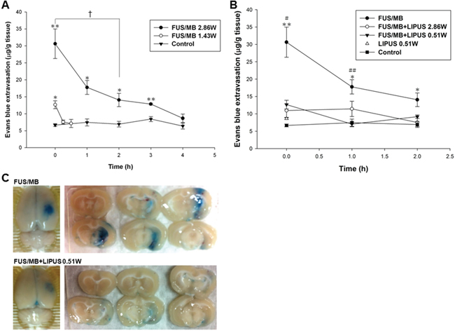 Figure 1: EB extravasation was assessed in the brain after sonication. A. Graph shows the EB extravasation of 200 μL/kg UCA within 4 h after sonication in right and left (control group) brain hemispheres with and without sonication at an acoustic power of 1.43 or 2.86 W. B. Graph showing the amount of EB extravasation as a function of time after single or repeated sonication. EB extravasation was largest immediately after the sonications and rapidly decreased within 2 h. C. Distribution of BBBD for FUS/MB and FUS/MB+LIPUS group as evaluated by the extravasation of EB into the brain in the sonicated right hemisphere and the corresponding brain surface. * and # denote significantly different from control and FUS/MB+LIPUS group, respectively (*, # and †, p < 0.05; ** and ##, p < 0.01, n = 3).