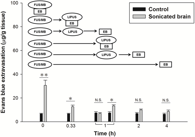 Figure 2: Time window evaluation for the duration of BBBD comparing a LIPUS sonication with an interval of 20 min or 1 h following the first FUS/MB application. (*p < 0.05; **p < 0.01, n = 3). N.S. means no significance.