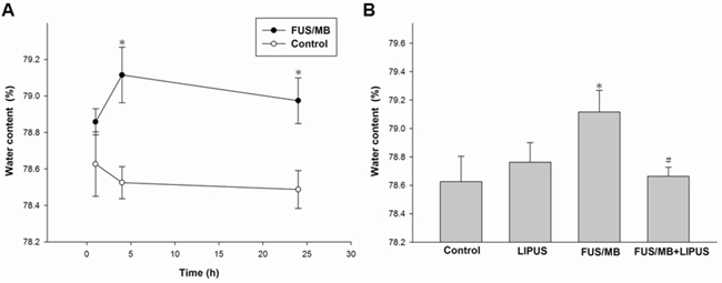 Figure 3: Assessment of cerebral water content induced by FUS/MB application. A. Cerebral water contents at 1, 4, and 24 h after FUS/MB application. B. Water contents increased after FUS/MB and then significantly decreased after LIPUS treatment. * and # denote values significantly different from control and FUS/MB group, respectively (* and #, p < 0.05, n = 4).