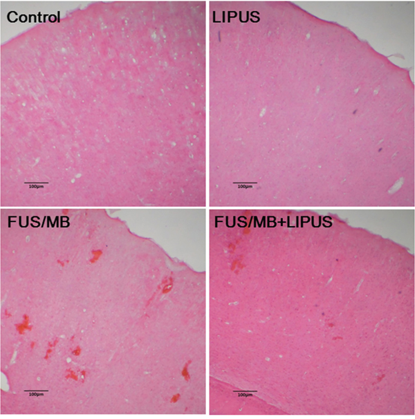 Fig. 4 shows representative samples of the histologic evaluation of H&E-stained sections. No damage was observed in the brain treated with LIPUS alone. Obvious hemorrhages in the sonicated region suggest BBBD after FUS/MB application. Fewer extravasated erythrocytes were seen within the sonicated region treated with LIPUS following FUS/MB application.
