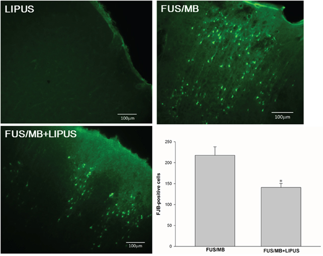 Figure 5: Effects of LIPUS treatment on neuronal degeneration. A representative Fluoro-Jade B (FJB)-stained brain section of a sonicated region. Quantification analysis indicated that rats treated with LIPUS following FUS/MB had significantly fewer degenerating neurons than FUS/MB-treated rats. The total number of FJB-positive cells is expressed as the mean number per field of view (0.8 mm2). The scale bar is 100 μm. * denotes a value significantly different from that of the FUS/MB group (*p < 0.05, n = 3).
