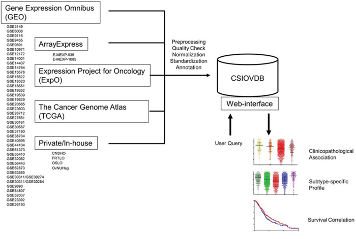 Figure 1: Structure of CSIOVDB. CSIOVDB housed data of human ovarian carcinoma from GEO, ArrayExpress, TCGA, ExpO, and private/in-house. The data from different cohorts were compiled, and subjected to quality check, RMA normalization, and standardization to remove batch effect. Clinical annotation was extracted from the data repository or original publication. User can query a gene of interest to CSIOVDB using a browser. Output of the query includes clinical association of the gene expression, gene expression profiles in different histologies, molecular subtypes, as well as survival correlation. Molecular subtype-specific correlation is also provided.