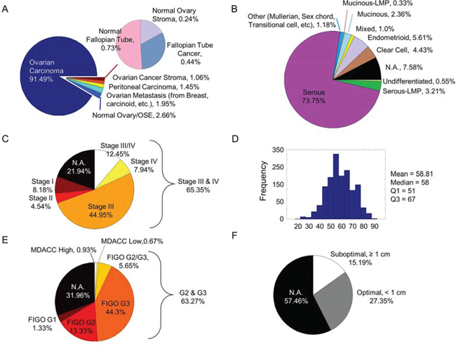 Figure 2: Clinico-pathological profiles of CSIOVDB. Pie charts or histogram showing distribution of various parameters in CSIOVDB: A. disease state, B. WHO histology, C. FIGO staging, D. age, E. FIGO grading or MDACC two-tier grading, and F. surgery debulking status. Abbreviation: N.A., not available.