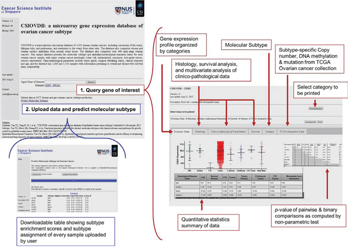 A screenshot of CSIOVDB is given in Figure 3 summarizing the features available. At the main page, there are two functions available: first, users can choose to query a gene of interest to CSIOVDB. At the result page of gene queried, the expression profiles of gene of interest are organized into different categories: disease state, histology, clinico-pathological parameters, and molecular subtype. In addition, molecular subtype-specific copy number, mutation, and DNA methylation profile from TCGA of the queried gene are provided in a separate tab. Quantitative statistics such as mean, median, upper and lower quantiles are available. Pairwise and binary significance assessments were performed using Mann-Whitney, Spearman correlation coefficient, or log-rank test. Multivariate Cox regression of queried gene and clinico-pathological parameters was also performed. User can select a subset of categories to be printed. Second, users can upload dataset for computation of ovarian molecular subtype. The computation method is based on two-sample Kolmogorov-Smirnov test and a subtype signature as described in previous work [5]. Computation of EMT score can be requested through email or from [10].