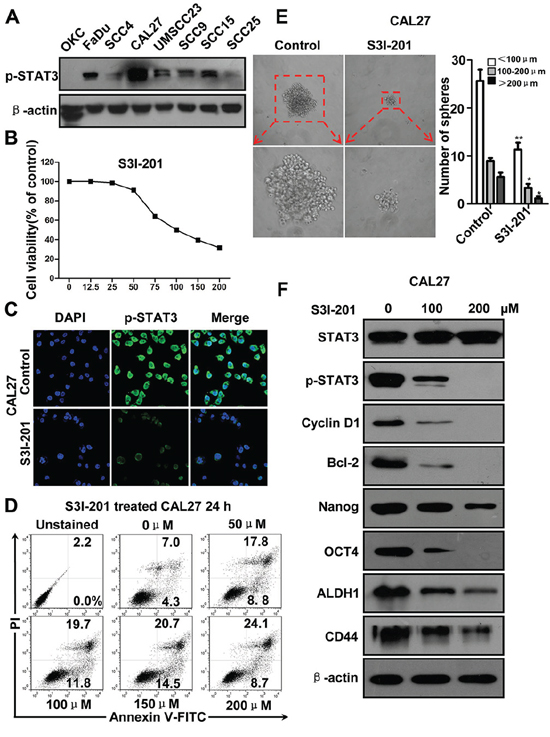 Figure 2: STAT3 inhibition by S3I-201 in HNSCC CAL27 cell line. A. Western blotting of p-STAT3Tyr705 of HNSCC cell lines as compared with oral keratinocyte cell line (OKC). B. Cell growth of CAL27 was measured using a CCK8 assay after with S3I-201 for 24 h in different concentrations. C. Immunoflurosece shows S3I-201 reduce nuclear expression of p-STAT3Tyr705 by confocal microscope. D. Representative flow cytometry shows S3I-201 increase apoptosis cells in CAL27 cell line in a dose dependent manner. E. Sphere formation analysis shows S3I-201 decrease CAL27 tumor-sphere formation. Mean ± SEM *,P < 0.05; **,P < 0.01. F. Western blotting shows S3I-201 treatment decrease Cyclin D1, Bcl2 and self-renewal marker Nanog, OCT4, ALDH1, and CD44 in a dose dependent manner. Data shown are representative of three individual experiments.