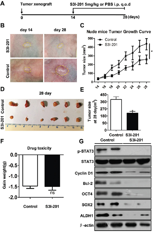 Figure 3: STAT3 inhibition reduces tumor growth and CSCs in HNSCC xenograft model. A. Schematic diagram for the xenograft implantation and drug delivery. STAT3 signaling inhibitor S3I-201 (5 mg/kg) or equivalent volume PBS (control) was given by intraperitoneal injection (i.p) every other day (q.o.d) in CAL27 cells xenograft nude mice for consecutively 14 days (n = 6 mice, respectively). B. Representative images showed tumor regression in HNSCC xenograft treated with S3I-201 (upper) as compared with control group. Dahs lines were utilized to depict the outline of tumor lump. C. Total tumor volume was assessed in S3I-201 and control treatment every other day. *,P < 0.05. D. Representative images of tumor lump dissected from xenograft mice showed tumor harvest from nude mice with S3I-201 or control treatment. E. Tumor size from CAL27 xenograft in both S3I-201- and control-treated mice; *,P < 0.05 F. Drug toxicity was assessed by gained body weight of CA27 xenograft mice in each group. G. Western blotting shows S3I-201 decrease protein expression of p-STAT3, Cyclin D1, Bcl-2 and CSCs related markers OCT4, SOX2 and ALDH1 as compared with control group, while the protein level of STAT3 had no change. β-actin was used as loading control.