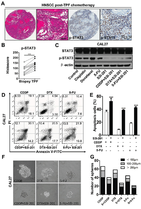 Figure 5: Increased expression of p-STAT3 in recurrence HNSCC after combined TPF chemotherapy and STAT3 signaling inhibition reduces chemoresistance of HNSCC in vitro. A. Representative hematoxylin-eosin staining (HE) and IHC of p-STAT3Tyr705 significantly increased in HNSCC tissue post neoadjuvant TPF chemotherapy of cisplatin (CDDP), Docetaxel (DTX) and 5-fluoracil (5-FU) with quantification of histoscore in B. Data present as mean ± SEM, ***, P < 0.001. C. Single chemo reagents 10 μM cisplatin (CDDP), 10 μM Docetaxel (DTX) and 15 μM 5-fluoracil (5-FU) increase p-STAT3Tyr705 in CAL27 cell line, which may attenuate by combined S3I-201 (100 μM) treatment (24 h). D. Combinatorial conventional chemotherapy with S3I-201 increase apoptosis cell population of DTX, CDDP and 5-FU with quantification in E. F. In vitro tumor-sphere formation of DTX, CDDP and 5-FU with or without S3I-201 treatment. G. Quantification of tumor-sphere number of DTX, CDDP and 5-FU with or without S3I-201 treatment. Data shown are representative of three individual experiments.