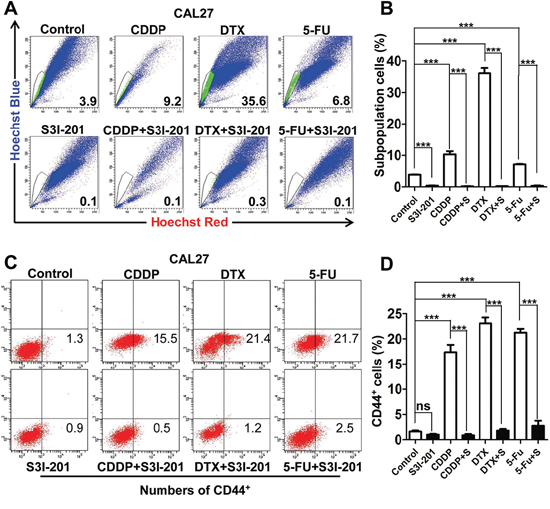 Figure 6: STAT3 inhibition attenuates chemo reagents enriched CSCs population in vitro. A. Representative images of 10 μM cisplatin (CDDP), 10 μM Docetaxel (DTX) and 15 μM 5-fluoracil (5-FU) enrichment side population, which may attenuate by combined treatment of S3I-201. B. Quantification of side population. C. STAT3 inhibition by S3I-201 effectively reduced DTX, CDDP, 5-FU enriched CD44+ population as compared with single reagent counterpart. D. Quantification of side population. Data shown are representative of three individual experiments.