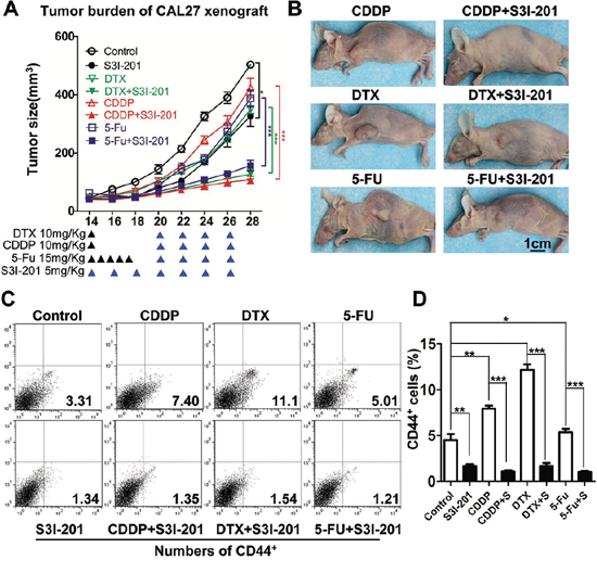 Figure 7: Combined STAT3 inhibition with TPF chemotherapy enhance anti-tumor effect in vivo. A. Tumor growth curve and B. representative photo of DTX, CDDP, 5-FU, S3I-201 or combinational chemotherapy. 10 mg/kg DTX or CDDP were infused at day 14 and 15 mg/kg 5-FU was infused every day from day14 to day 19. The S3I-201 only group receive 5 mg/kg S3I-201 every other day and combined group receive additional 5 mg/kg S3I-201 every other day (as indicated by blue ▲) from day 21.n = 5 mice respectively. C. The xenografts from nude mice receiving DTX, CDDP, 5-FU, S3I-201 or combinational chemotherapy and analyzed by CD44+ flow cytometry. D. Quantification of CD44+ population. Data present as mean ± SEM, *, P < 0.05; **, P < 0.01; ***, P < 0.001.
