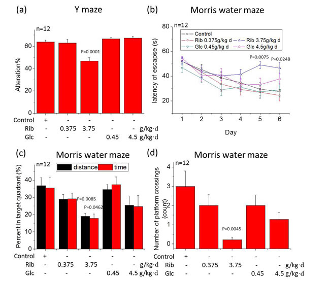 To determine whether oral administration of D-Ribose affects learning and memory of mice, the Y maze spontaneous alteration test as described [31] and the Morris water maze were performed (Figure 1). D-Ribose-treated mice (3.75 g/kg·d) showed significantly less alteration compared with other experimental groups and normal control (Figure 1a, n = 12, P = 0.0001). Total arm entries did not differ (data not shown). According to Stewart and colleagues [32], a high dose of D-Ribose administration declines memory functions in mice.