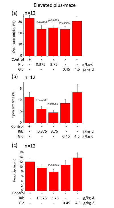 Figure 2: Elevated plus-maze test. Mice were gavaged with D-Ribose or D-Glucose for 6 months as described in Figure 1. In the elevated plus-maze, the percentage of the time spent (min) in the open arms (a), the number of open arm entries (b) and head dipping (c) within 5 min was recorded. All values are expressed as mean±S.E.M. The P values are obtained from comparative analysis of indicated group with the controls.