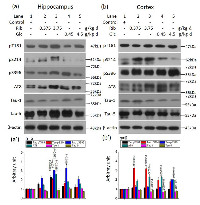 Figure 3: Tau phosphorylation in the hippocampus of D-Ribose- and D-Glucose-treated mice. Conditions for the treatment were the same as for Figure 1, except that phosphorylation of Tau in the hippocampus and cortex was detected by Western blotting using anti-pT181, anti-pS214, anti-pS396, anti-AT8, anti-Tau-1 and anti-Tau-5 (a, b), respectively. β-Actin was used as a loading control. Quantification is shown in a’ and b’. The saline control value was set as 1.0. The phosphorylation levels were expressed as the ratio between phospho-site and the total Tau staining. A full picture of the blots can be found in the Supplementary Information. All values are expressed as mean±S.E.M. The P values are obtained from comparative analysis of indicated group with the controls.