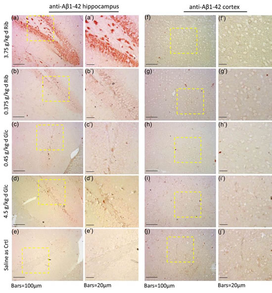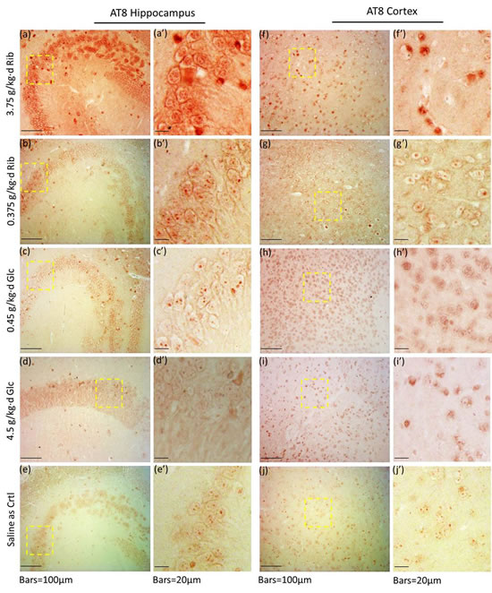 Figure 4: Immunohistochemical staining of AT8 in hippocampus and cortex. Mice were gavaged with D-Ribose at 3.75 g/kg·d (a, a’, f, f’), D-Ribose at 0.375 g/kg·d (b, b’, g, g’), D-Glucose at 0.45 g/kg·d (c, c’, h, h’), D-Glucose at 4.5 g/kg·d (d, d’, i, i’) and saline (e, e’, j, j’) for 6 months, and the hippocampal and cortex slices were prepared as described in Materials and Methods. AT8 in the hippocampus (a, a’-e, e’) and cortex (f, f’-j, j’) was detected by immunohistochemistry using anti-Tau [AT8] polyclone antibody.
