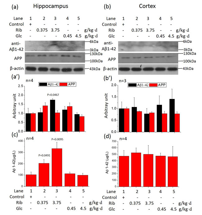 Figure 5: Changes in amyloid-β (Aβ) like product levels in the brain of sugar-treated mice. Conditions for the treatment were the same as those given in Figure 1, except that the expression of Aβ1-42 and APP in hippocampus (a) and cortex (b) were detected by Western blotting using anti-Aβ1-42 polyclonal antibody and anti-APP polyclonal antibody. β-Actin was used as a loading control. Quantification is shown in a’ and b’. The saline control value was set as 1.0. A full picture of the blots can be found in the Supplementary Information. Aβ-like product levels were assayed in hippocampus (c) and cortex (d) by ELISA. All values are expressed as mean±S.E.M. The P values are obtained from comparative analysis of indicated group with the controls.