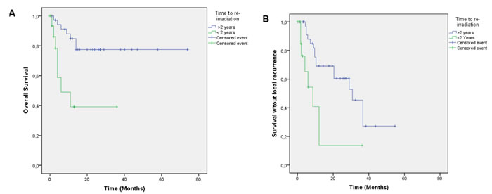 Figure 2 A: Overall survival according to time to re-irradiation. Footnote: > 2 years to re-irradiation (blue), < 2 years to re-irradiation (green), p = 0.001. B: Survival without local recurrence according to time to re-irradiation. Footnote: > 2 years to re-irradiation (blue), < 2 years to re-irradiation (green), p = 0.002.