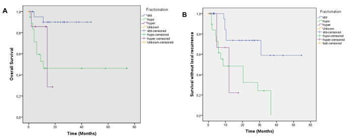 Figure 3: A; Overall survival according to fractionation scheme. Footnote: Standard Fractionation (blue), Hypofractionation (green), Hyperfractionation (purple), Unkown (orange), p=0.002 Standard vs Hypofractionation, p= 0.02 Standard vs Hyperfractionation p=0.59 Hypofractionation vs hyperfractionation. B; Survival without local recurrence according to fractionation scheme. Footnote: Standard Fractionation (blue), Hypofractionation (green), Hyperfractionation (purple), Unkown (orange), p = 0.01 Standard vs Hypofractionation, p = 0.04 Standard vs Hyperfractionation p=0.87 Hypofractionation vs hyperfractionation