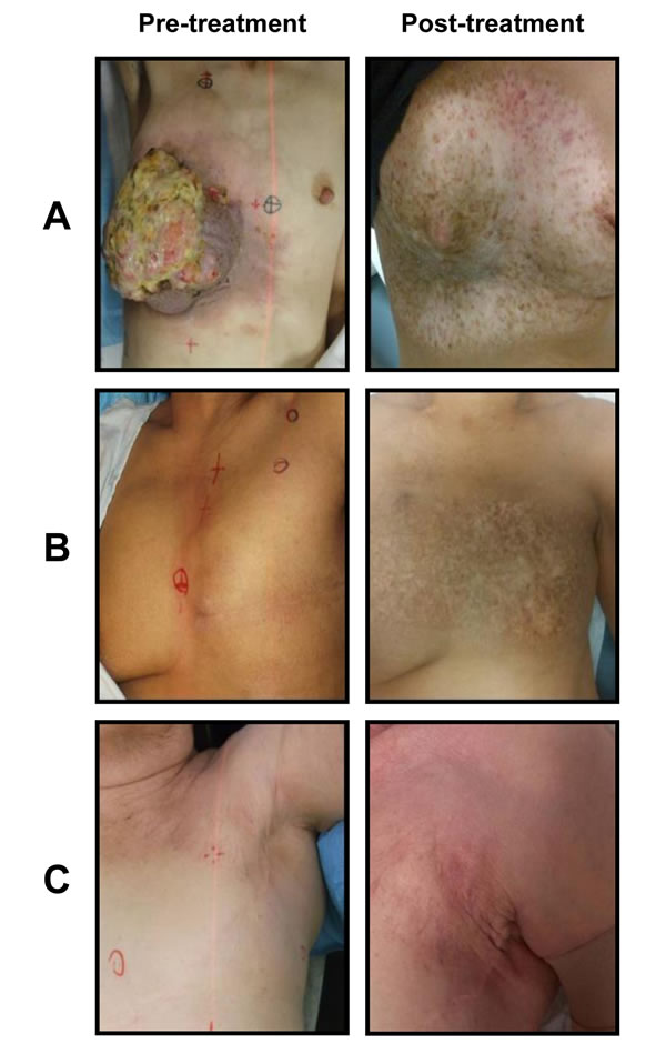 Figure 4: Treatment effects after whole chest wall/breast + nodal fields irradiation. Footnote: Three cases presented (Figures 4A, 4B, 4C). Patient A was originally treated for right sided invasive ductal carcinoma. 31 years later presented with triple negative un-resectable fungating mass. She was treated with re-irradiation with concomitant weekly cisplatin 20 mg/m2. She received 65 Gy in 25 fx BID to the breast + lymph node area and then a boost of 16 Gy in 8 fractions. Eighteen months post-treatment image shows significant fibrosis and telangiectasia but no residual disease. Patient B was originally treated with a mastectomy for an invasive ductal carcinoma and adjuvant radiotherapy (50 Gy in 25 fx) to the chest wall and lymph node area. 24 months after developed a 6.0 cm recurrence on the chest wall. She received 65 Gy in 25 fx BID. Postreatment image shows significant hyperpigmentation but no evidence of recurrence. Patient C was treated with a lumpectomy and adjuvant radiotherapy to the breast 42.5 Gy in 16 fx. 67 months after, she developed an axillary recurrence. She had re-irradiation to the chest wall and axilla 50 Gy in 25 fx and a boost of 16 Gy to the recurrent tumour. Image postreatment show some telangiectasia and fibrosis but no disease recurrence.