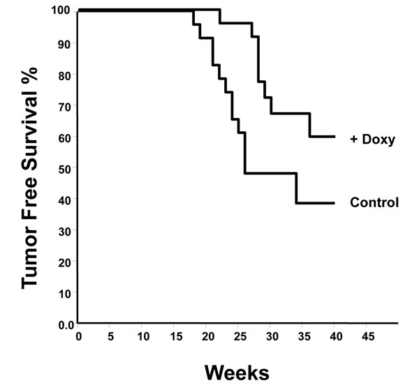 Figure 2: Kaplan-Meier analysis of tumor development in MMTV-rtTA:IL24tet-on:MMTV-Her2/neu triple compound transgenic mice fed regular chow (controls) or chow containing doxycycline. Hazard ratio 2.1 (P = 0.005).