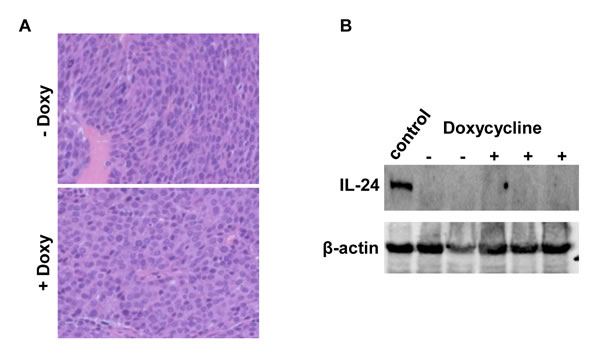 Tumors from both groups were fixed for histological analysis. Those from control mice not administered doxycycline were typical, poorly differentiated adenocarcinomas as previously characterized in these animals (Figure 3A). Tumors from doxycycline-treated mice were indistinguishable from the control group. Western analysis showed no MDA-7/IL-24 expression in tumors from either doxycycline-treated mice or untreated mice (Figure 3B). This result was confirmed in Western blots performed with a three-fold increase (150 μg) in the amount of protein loaded per lane (data not shown).