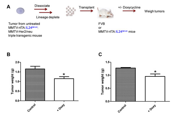 Figure 4: A. Schematic of experimental design. B. Effect of mda-7/IL-24 expression on the growth of tumor cells from MMTV-rtTA:IL24tet-on:MMTV-Her2/neu triple transgenic mice fed regular chow, which were dissociated into single cells and transplanted into FVB mice. The FVB mice were then fed regular chow or chow containing doxycycline for 12 weeks. Tumors were dissected and weighed (n = 8, P = 0.0275; unpaired Student t-test). C. Effect of MDA-7/IL-24 expression on growth of tumor cells from MMTV-rtTA:IL24tet-on:MMTV-Her2/neu triple transgenic mice fed regular chow, which were dissociated into single cells and transplanted into MMTV-rtTA:IL24tet-on double transgenic mice. The double transgenic mice were then fed regular chow or chow containing doxycycline for 12 weeks before MMTV-rtTA:IL24tet-on:MMTV-Her2/neu tumors were dissected and weighed (n = 8, P = 0.0152; unpaired Student t-test).