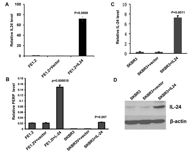 Figure 5: MDA-7/IL-24 directly induces PERP transcription. A. Expression of mda-7/IL-24 by Q-rtPCR in FE1.3 cells alone and in FE1.2 cells transfected with vector (FE1.2+vector) or MSCV-IL-24 (FE1.2+IL-24), as previously described (44). B. Expression of PERP by Q-rtPCR in FE1.2 or SKBR3 cells transfected with vector or mda-7/IL-24 retroviruses. C. Expression of MDA-7/IL-24 by Q-rtPCR in SKBR3 cells transfected with vector or mda-7/IL-24 retroviruses. D. Expression of MDA-7/IL-24 by Western blotting in SKBR3 cells transfected with empty vector or mda-7/IL-24 retroviruses.