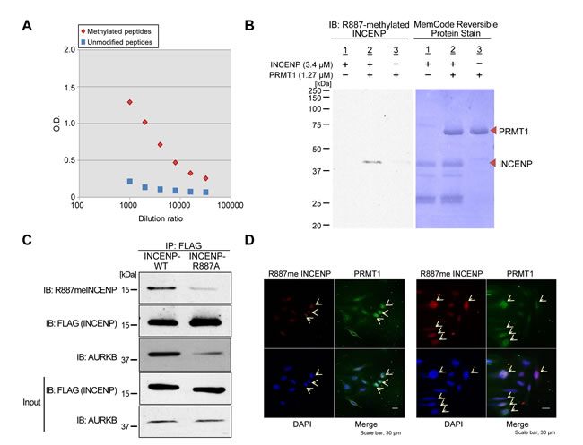 Figure 2: In vivo methylation of INCENP by PRMT1. A. Determination of the titer and specificity of the anti-mono-methylated R887 INCENP antibody analyzed by ELISA. B. Validation of the anti-mono-methylated R887 INCENP antibody. Recombinant GST-tagged INCENP protein and S-adenosyl-L-methionine (SAM) were incubated in the presence of BSA or recombinant PRMT1. Samples were immunoblotted with the anti-mono-methylated R887 INCENP antibody, and amounts of loading proteins were evaluated by staining with MemCodeTM Reversible Protein Stain. C. 293T cells were co-transfected with a FLAG-INCENP-WT (amino acids 821-918) vector or a FLAG-INCENP-R887A (amino acids 821-918) vector and an HA-PRMT1 vector. The samples were immunoblotted with anti-mono-methylated R887 INCENP, anti-FLAG and anti-AURKB antibodies after immunoprecipitating with anti-FLAG M2 agarose (Sigma-Aldrich). D. HeLa cells were transfected with FLAG-PRMT1-WT and immunocytochemistry was performed with anti-FLAG (Sigma-Aldrich, M2, dilution: 1:100, green) and anti-R887meINCENP (dilution: 1:100, green) antibodies. Nuclei were stained with 4’,6-diamidino-2-phenylindole (DAPI, blue). Transfected HeLa cells exhibited higher INCENP and R887meINCENP integrated densities.