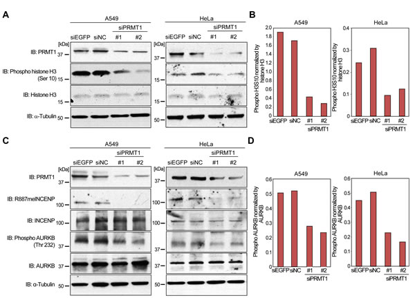 Figure 3: Regulation of AURKB activity by PRMT1. A. Effects of PRMT1 knockdown on the phosphorylation of histone H3 at serine 10. A549 and HeLa cells were transfected with control siRNAs (siEGFP and siNC) and PRMT1 siRNAs (#1 and #2) for 72 h. Cells were lysed with CelLyticTM M reagent, and samples were immunoblotted with anti-PRMT1, anti-phospho histone H3S10, anti-histone H3 and anti-α-Tubulin antibodies. B. X-ray films in A. were scanned with GS-800TM calibrated densitometer (Bio-Rad), and the intensity of phospho H3S10 levels was normalized by histone H3 expression levels. C. PRMT1 regulates AURKB activity. A549 and HeLa cells were transfected with control siRNAs (siEGFP and siNC) and PRMT1 siRNAs (#1 and #2) for 72 h. Cells were lysed with CelLyticTM M reagent, and samples were immunoblotted with anti-PRMT1, anti-R887meINCENP, anti-INCENP, anti-phospho AURKB (threonine 232), anti-AURKB and anti-α-Tubulin antibodies. D. X-ray films in C. were scanned with GS-800TM calibrated densitometer (Bio-Rad), and the intensity of phospho AURKB at threonine 232 levels was normalized by AURKB expression levels.