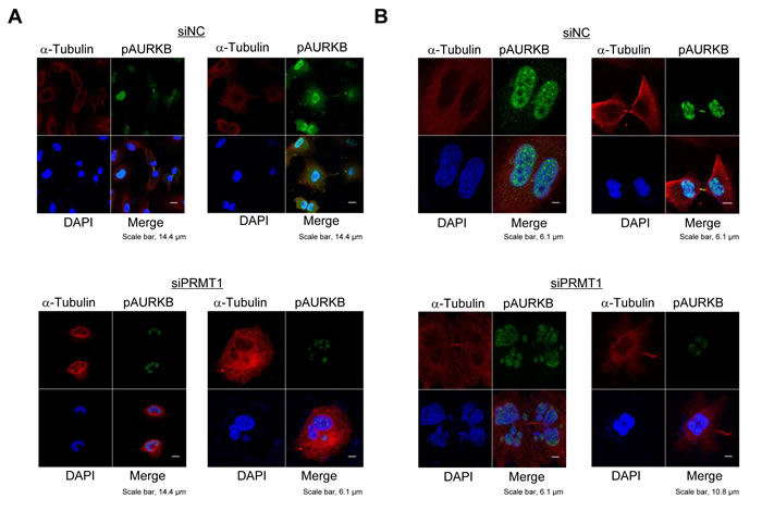 Figure 4: PRMT1 knockdown causes abnormal chromosome alignment and chromosome segregation. A549 cells A. and HeLa cells B. were transfected with siNC (control) or siPRMT1#1 for 48 h, and then treated with 7.5 µg/ml of aphidicolin for 24 h. Cells were fixed with 4% paraformaldehyde, and then stained with an anti-phospho AURKB antibody (Alexa Fluor® 488, green), an anti-α-Tubulin antibody (Alexa Fluor® 594 [red]) and 4’,6’-diamidine-2’-phenylindole dihydrochloride (DAPI [blue]) 15 h after release of cell cycle. The percentage of cells, which showed abnormal chromosome alignment and chromosome segregation, were 74.4% (A549) and 72.9% (HeLa) to the total number of cells.