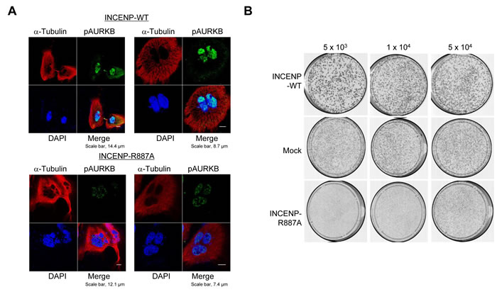 Figure 5: PRMT1-mediated methylation of INCENP at R887 is critical for proper mitotic progression of cancer cells. A. HeLa cells were transfected with wild-type INCENP (INCENP-WT) and R887-subtituted INCENP (INCENP-R887A), and then stained with an anti-phospho AURKB antibody (Alexa Fluor® 488, green), an anti-α-Tubulin antibody (Alexa Fluor® 594 [red]) and 4’,6’-diamidine-2’-phenylindole dihydrochloride (DAPI [blue]) 15 h after release of cell cycle. The percentage of cells, which showed abnormal chromosome alignment and chromosome segregation, were 55.8% to the total number of cells. B. HeLa cells were transfected with pCAGGS-n3FC-Mock, pCAGGS-n3FC-INCENP-WT and pCAGGS-n3FC-INCENP-R887A for 24 h, and then re-inoculated at the concentration of 5 x 103 cells/dish, 1 x 104 cells/dish or 5 x 104 cells/dish with the medium containing 0.8 (mg/ml) of Geneticin®. Cells were fixed with methanol and then stained with Giemsa.