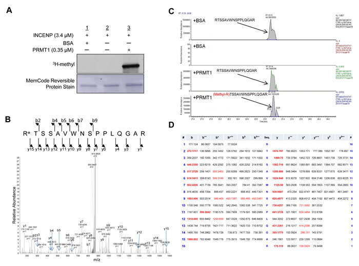 Figure 1: PRMT1 methylates INCENP in vitro. A. Recombinant INCENP protein was methylated by PRMT1. An in vitro methyltransferase assay was performed by using purified GST-tagged INCENP and PRMT1 recombinant proteins. Methylated INCENP was detected by fluorography. Amounts of loading proteins were evaluated by staining with MemCodeTM Reversible Protein Stain (Thermo Fisher Scientific). B. The LC-MS/MS spectrum corresponding to the mono-methylated INCENP 887–902 peptide of a tryptic digest of which in vitro methylated INCENP by PRMT1. The 14 Da increase of the Arg 887 residue was observed by y15 ion. C. Selected full MS ion chromatograms of unmodified and mono-methylated INCENP 887-902 peptides in the LC-MS/MS. D. The theoretical values of MS/MS fragments ions of the Arg 887 mono-methylated INCENP 887–902 peptides are summarized in the table. The abbrevations of fragment ion types were indicated by the MASCOT program (http://www.matrixscience.com/help/fragmentation_help.html). The observed ions in Figure 1B were indicated in red letters.