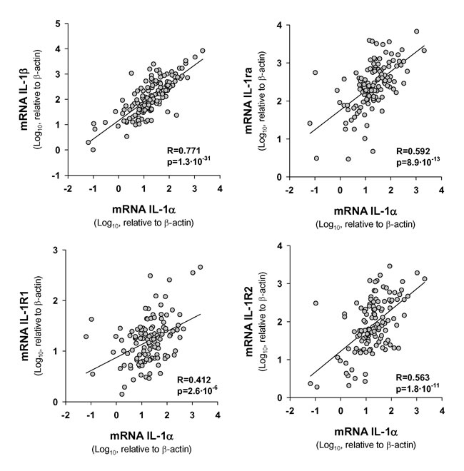 We studied the correlation between the expression of IL-1α and the expression of other related genes of the IL-1 family. Results in Figure 3 show a highly significant statistical association between IL-1α and either IL-1β or IL-1Ra. Moreover, we observed that the variation in levels of IL-1α correlated with that of IL-1 receptors, particularly with IL-1R2.