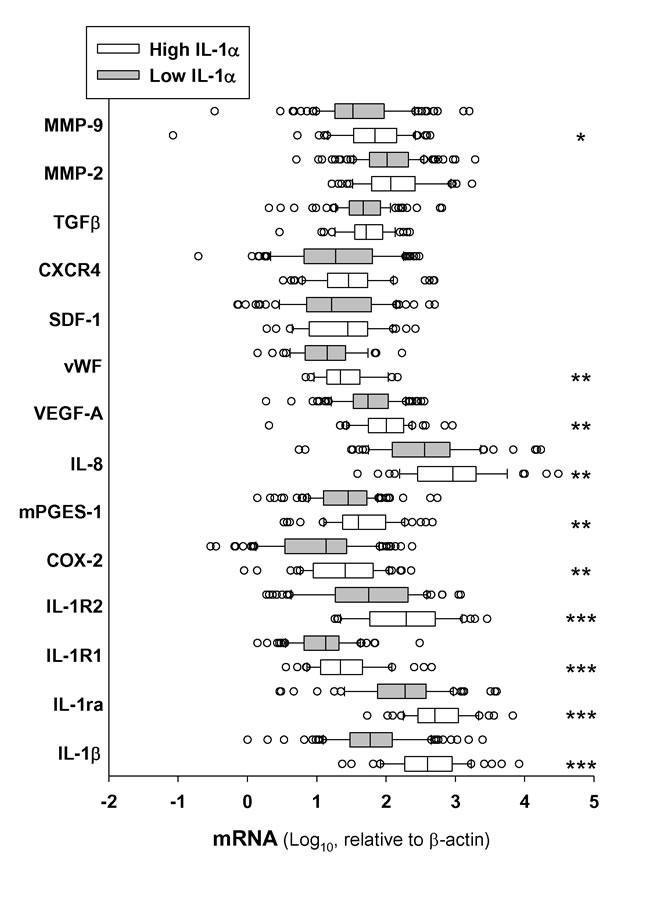 We next determined transcript levels of some genes related with the metastatic process that it is known to be regulated by IL-1. Results in Figure 4 indicate that most of these genes were enhanced in the high IL-1α group. Interestingly, the most enhanced expression, besides the IL-1 family genes, were the genes involved in angiogenesis, such as MMP-9, PGE2 biosynthetic machinery (COX-2 and mPGES-1), VEGF and IL-8. This was consistent with a significant high expression of the endothelial cell marker von Willebrand Factor (vWF) in the high IL-1α group of patients. In contrast, we found no statistically significant differences between patients stratified by the IL-1α expression in other IL-1α-related pathways, such as the chemokine for stem cells SDF-1 or SDF-1-receptor (CXCR4), the matrix degrading enzyme MMP-2, or the epithelial-mesenchymal transition promoter TGFβ (Figure 4).