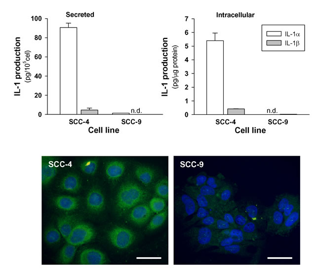Figure 5: Secreted and intracellular levels of IL-1α and IL-1β by HNSCC cell lines. Cells were incubated for 48 hours in 1% FBS. Thereafter, IL-1α and IL-1β were analyzed in the media and in the cell lysates (n = 3). Representative immunofluorescent staining for IL-1α is also shown (bars 50μm).