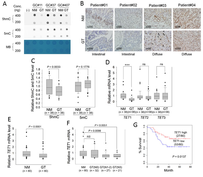 Figure 1: Measurement of global 5hmC and 5mC and expression of TET family genes in primary GTs. A. Dot blot assay for global levels of 5hmC and 5mC in three paired GTs and adjacent NMs with two different genomic DNA concentrations. A PCR product was used as negative control (−). MB, methylene blue staining (to estimate the relative concentration of DNA). B. Comparison of the 5hmC signature between NMs (upper) and GTs (lower) in FFPE tissues. All panels show immunostaining results with anti-5hmC. Patient#01 and #02: intestinal-type GCs; patient #03 and #04: diffuse-type GC (×200). Black arrowheads in the bottom panel for Patient#03 indicate the signet ring cells. C. ELISA for quantitation of 5hmC and 5mC in 38 paired GTs and adjacent NMs, according to the standard curves shown in Supplementary Figure 1. D. Quantitative real-time RT-PCR for TET family genes in GTs. This analysis was individually performed for TET1, TET2, and TET3 in the same clinical samples examined in Figure 1C. Each expression level was normalized to that of β-actin in each sample. ***P < 0.0001; ns, non-significant. E. Quantitative real-time RT-PCR of TET1 in 80 GTs. F. Association between TET1 expression and regional lymph-node metastasis. GTs were divided into three groups according to whether cancer cells had spread to lymph nodes: N0, no regional lymph-node metastasis; N1, metastasis in one to two regional lymph nodes; N2, three to six; N3, seven or more. For panels C-F, the box plots show the median, 25th and 75th percentiles, and outliers. G. Kaplan-Meier analysis of patient survival based on TET1 expression in GTs. The log-rank test was used to compare survival between the low- and high-TET1 expression groups of patients based on average TET1 expression.