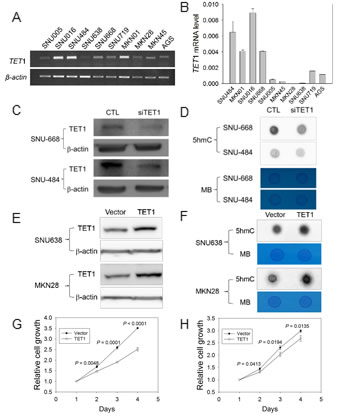 Figure 2: TET1 siRNA analysis and TET1 overexpression in GC cells. A., B. Analysis of TET1 mRNA level in 10 GC cell lines with RT-PCR .A. or quantitative real-time RT-PCR. B.β-actin was used as a control. C., D. TET1 expression in knockdown cells using TET1 siRNA. C. Western blotting with SNU484 and SNU668 cells in which siTET1 was transiently expressed. β-actin was used as a control (CTL). D. Dot blot assay with anti-5hmC using 700 ng DNA from the siTET1-treated cells in Figure 2C. E., F. Experiment for TET1 overexpression.E. Western blotting after TET1 transfection into SNU638 and MKN28 cells. β-actin was used as a control. F.Dot blot assay with anti-5hmC and DNA from transfected cells in Figure 2E with 700 ng DNA. G., H. Cell proliferation assay. Transfectants expressing vector only or the TET1 expression vector were cultured for 1-4 days, and then cell proliferation was measured using a CCK-8 kit (G, assay for SNU638; H, for MKN28). The data are cell index curves with mean ± SD from triplicate experiments. MB, methylene blue.